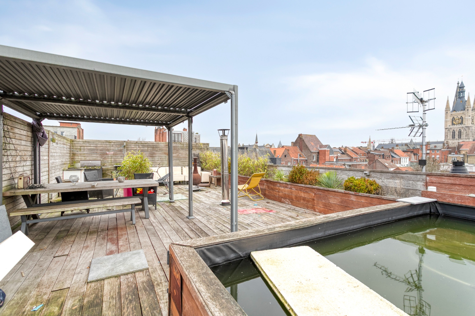 De aangename leefruimte sluit via een open trap naadloos aan op de huidige open keuken. Vanuit de keuken leidt een trap naar het zonnige dakterras: een zeldzame en rustige buitenruimte met uniek zicht op het historische stadscentrum.